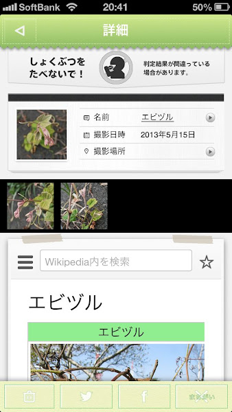判明した植物の名前と、Wikipediaが表示され、すぐにどういった植物なのか分かる仕組みになっています。エビヅルかぁ。どうやら僕が見つけたのは、若い株だったようです。落葉大木じゃあ、野草図鑑に載っていないのも納得ですね。